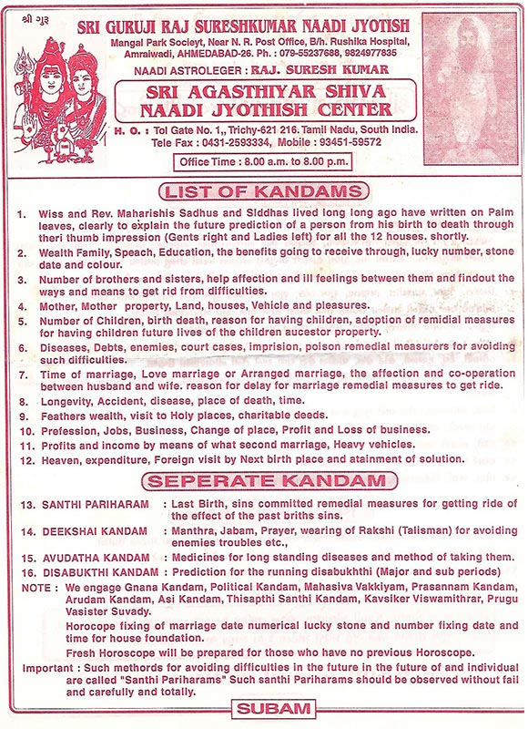 குறிப்பு : ஞான காண்டம், அரசியல்காண்டம், மகாசிவ வாக்கியம், பிரச்சனை காண்டம், ஆருட காண்டம், ஆசி காண்டம், திசாபுத்தி காண்டம், கௌசிகர், விசுவாமித்திரர், பிருகு, வசிஸ்டர் சுவடிகளும் பார்க்கப்படும்.